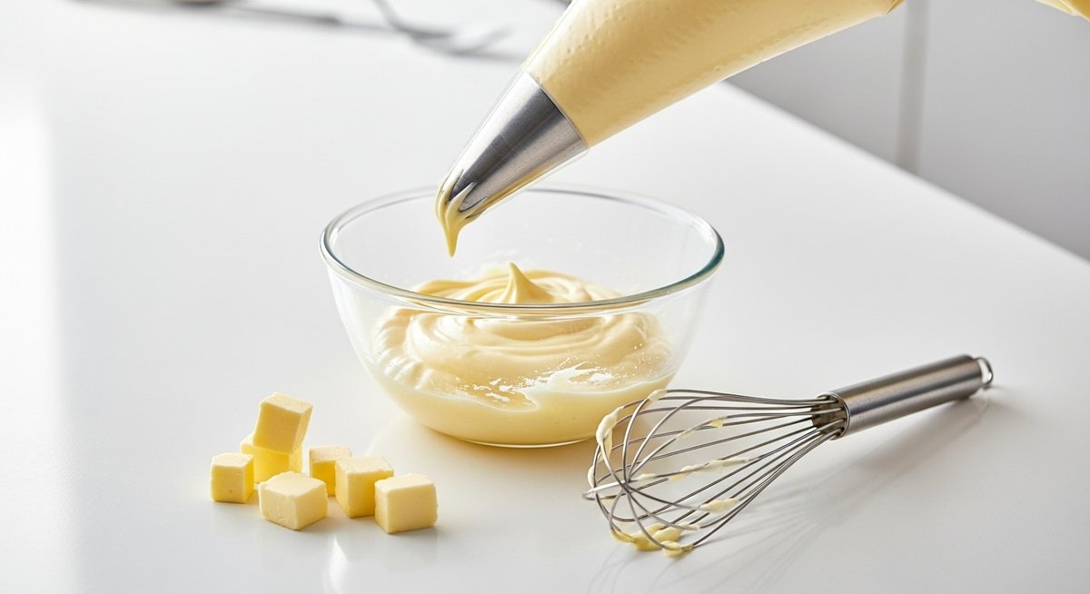 クレームムースリーヌのベースとなるのは、卵、牛乳、砂糖、小麦粉などで作る「クレームパティシエール(カスタードクリーム)」です。しかし、この二つには決定的な違いがあります。それは「バターの配合量」です。パティシエールにも少量のバターを加えることがありますが、ムースリーヌの場合はパティシエールの重量に対して30%から50%以上もの大量のバターを加えます。